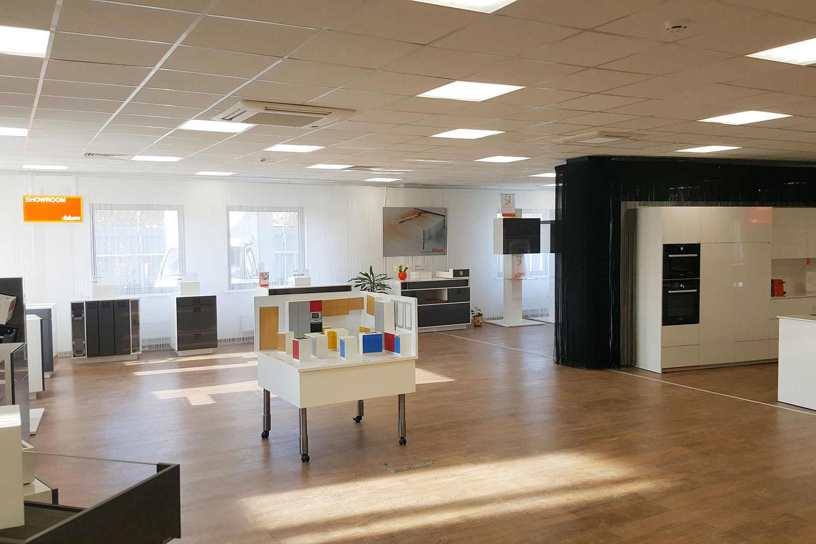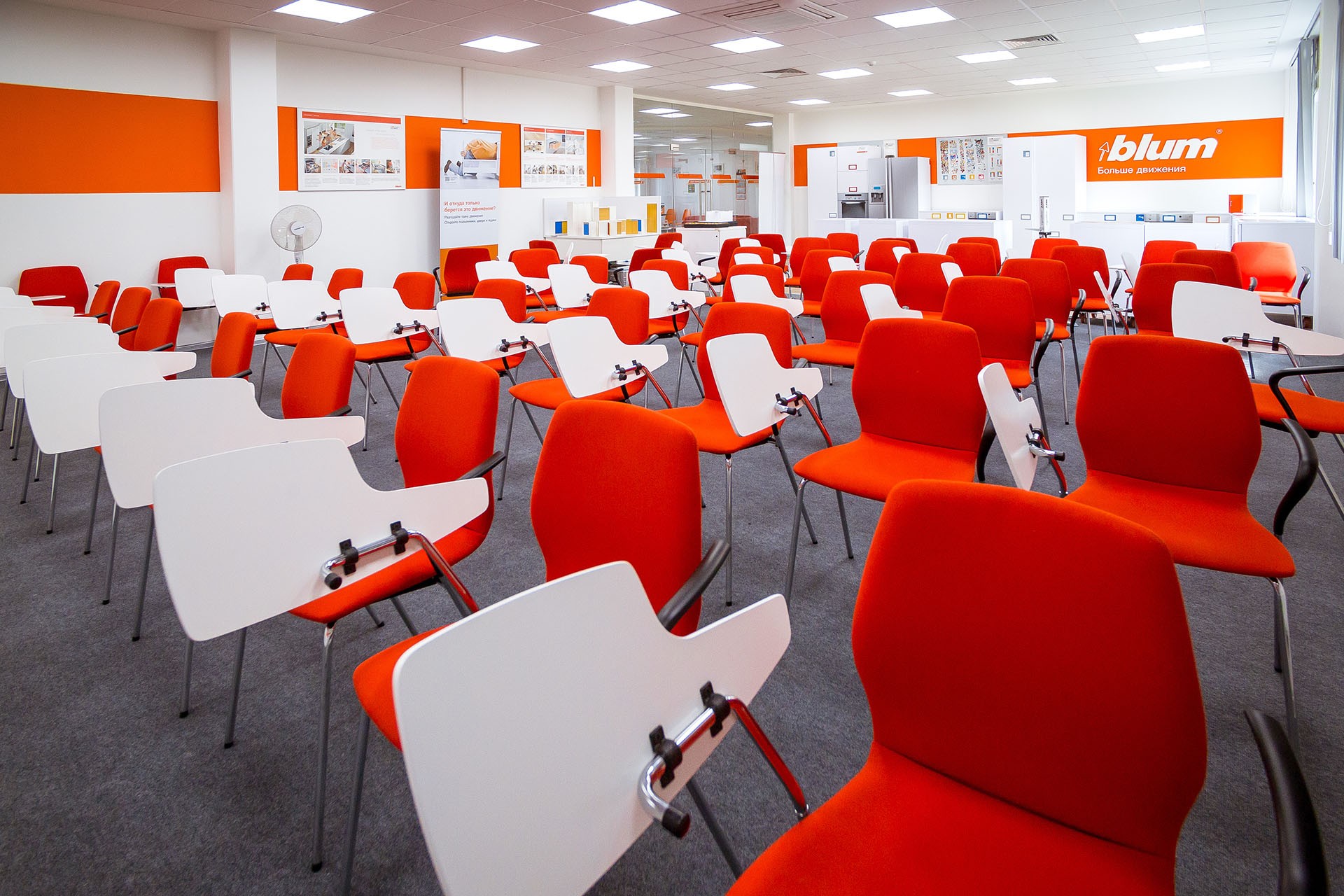 Учебный центр Blum располагает современным конференц-залом на 40 слушателей, двумя компьютеризированными классами на 20 слушателей каждый для теоретических занятий, учебным классом для проведения практических занятий, а также демонстрационным залом площадью 270 м2 со всеми изделиями и новинками Blum.