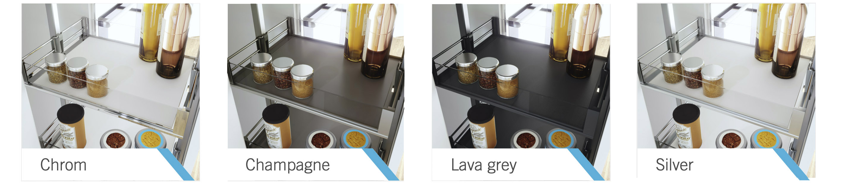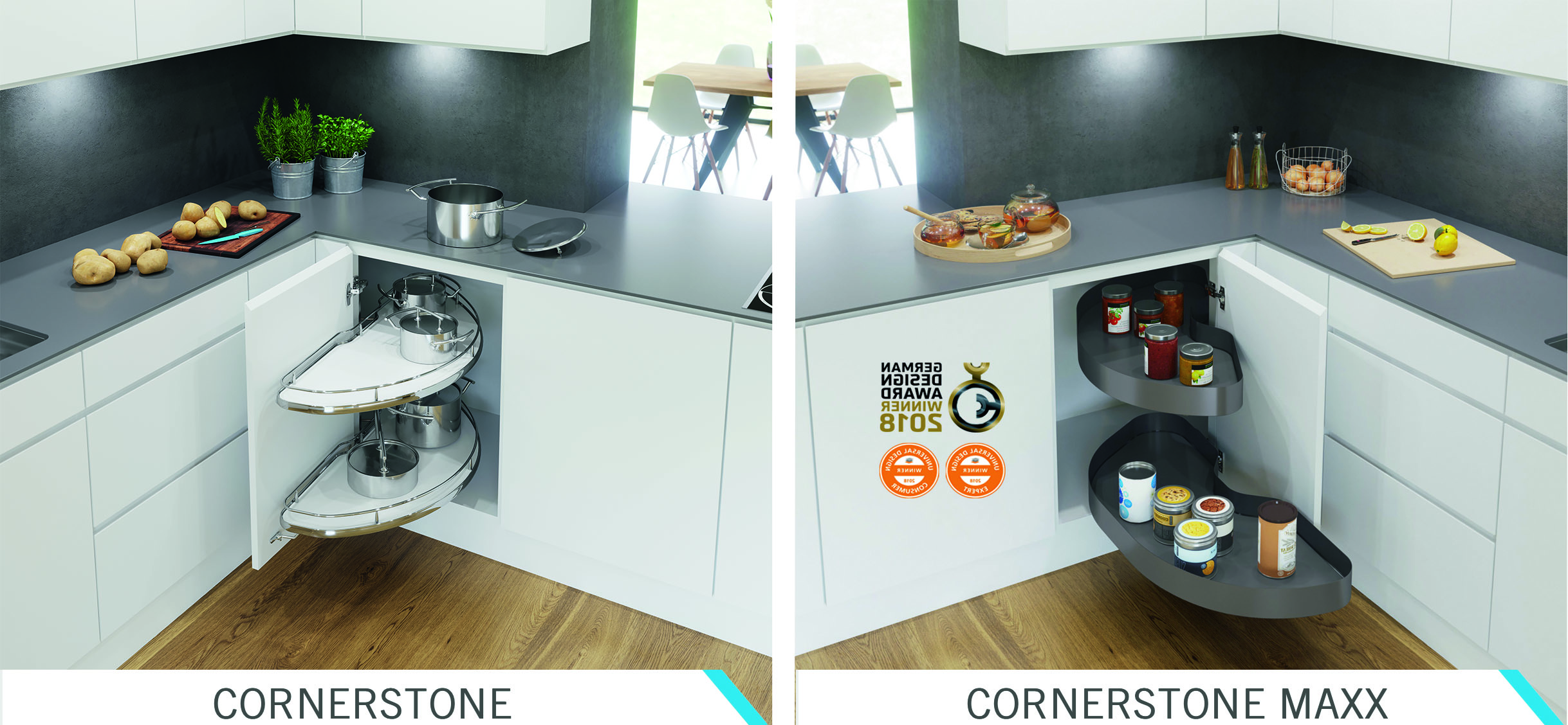 Особо элегантным видом отличаются системы с «парящими» полками правого и левого выдвижения CORNERSTONE, CORNERSTONE MAXX. Полки двигаются вперед и назад отдельно друг от друга и выходят вперед корпуса, не перекрывая соседнего. «Парящий» эффект достигается благодаря скрытой конструкции крепления. Эти системы выделяют дизайнеры за сочетание удобной эргономики и внешней красоты.