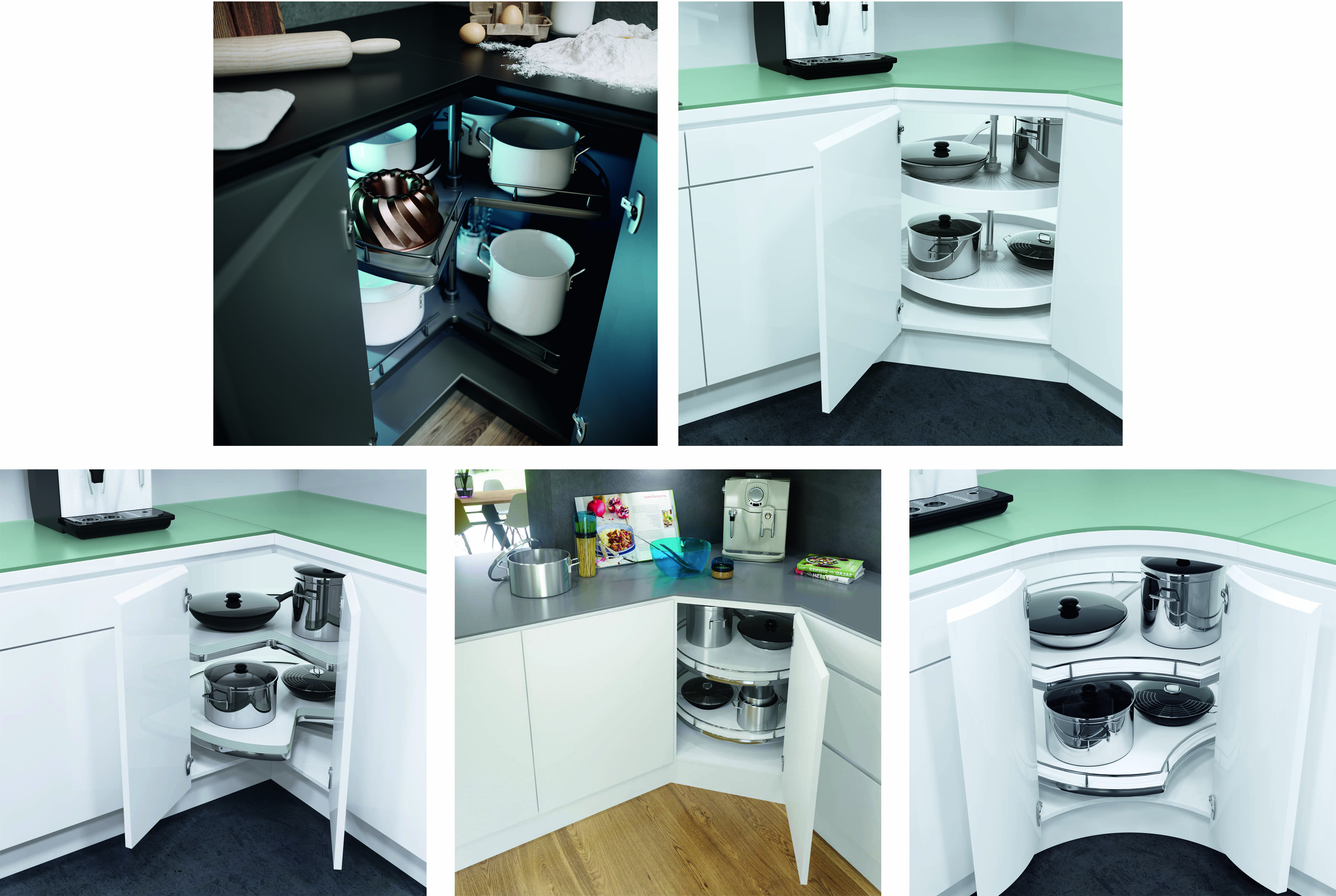 Ещё одно очень практичное решение для угловых шкафов — механизм «карусель», который подразумевает несколько вращающихся сетчатых (либо сплошных) полок или корзин с центральной осью и без неё. Это VS COR Wheel 3/4, VS COR Wheel 4/4 и VS COR Wheel Pro. Они легко поворачиваются, обеспечивая полный доступ к содержимому. Карусели без центральной оси, за счет экономии пространства, позволяют хранить предметы и посуду больших размеров: кастрюли, сковороды, формы для выпечки и прочее. Механизмы «карусель» можно устанавливать в шкафы под мойку, поскольку они крепятся к боковой стенке.