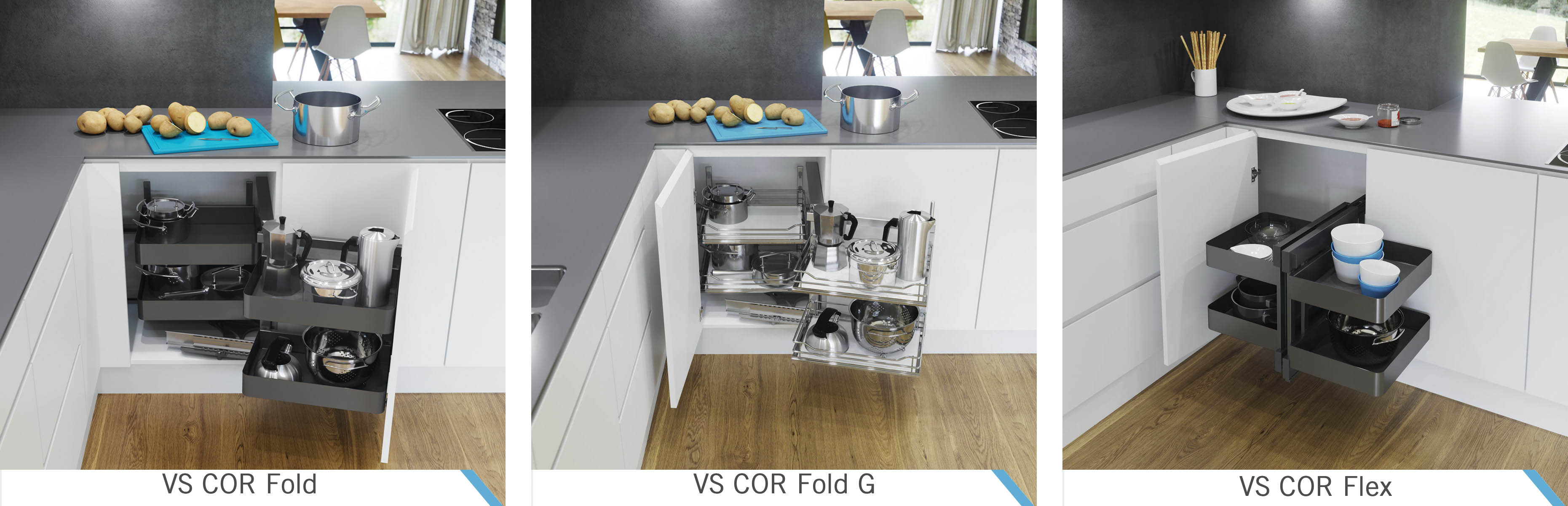 «Волшебный уголок» VS — это выдвижная система из двух частей, одна из которых, как правило, надежно закреплена на фасаде, а вторая перемещается внутри шкафа по направляющим. Система может состоять из полок или корзин, которые могут быть как сетчатые, так и сплошные, с бортиками и без. Очень популярны системы из четырех корзин: VS COR Fold с фронтальным креплением, а также VS COR Fold G и VS COR Flex с ручкой для выдвижения. При открывании дверцы шкафа, передние корзины автоматически отводятся в сторону и открывают доступ к внутренним корзинам. Всё содержимое как на ладони, что очень удобно даже для людей с ограниченными возможностями.