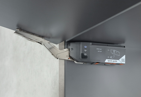 - Невероятная легкость открывания! Совершенно другая кинематика, по-другому установлены рычаги и отрегулированы пружины. Теперь фасад можно открыть, прилагая минимум усилий, буквально одним пальцем, и так же, как у всех подъемных механизмов Blum, он остановится в любом нужном положении.