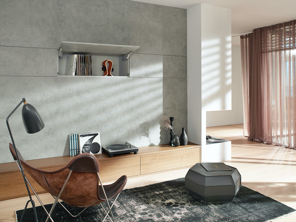 Минималистический дизайн и EXPANDO T. С подъемником AVENTOS HK top можно использовать фасады из различных материалов, массива дерева, МДФ, широкие и узкие алюминиевые рамки. Максимальная толщина фасадов — 30 мм. Независимо от веса фасада подъемник обеспечивает легкое и плавное открывание шкафов верхнего ряда. AVENTOS HK top можно использовать и с тонкими фасадами в сочетании с новой системой крепления EXPANDO T, которая помимо подъемных механизмов подходит также для дверей и ящиков. Это сейчас на самом пике мебельной моды, поскольку использование тонких и сверхтонких материалов невероятно популярно. Благодаря EXPANDO T можно использовать фасады от 8 мм!